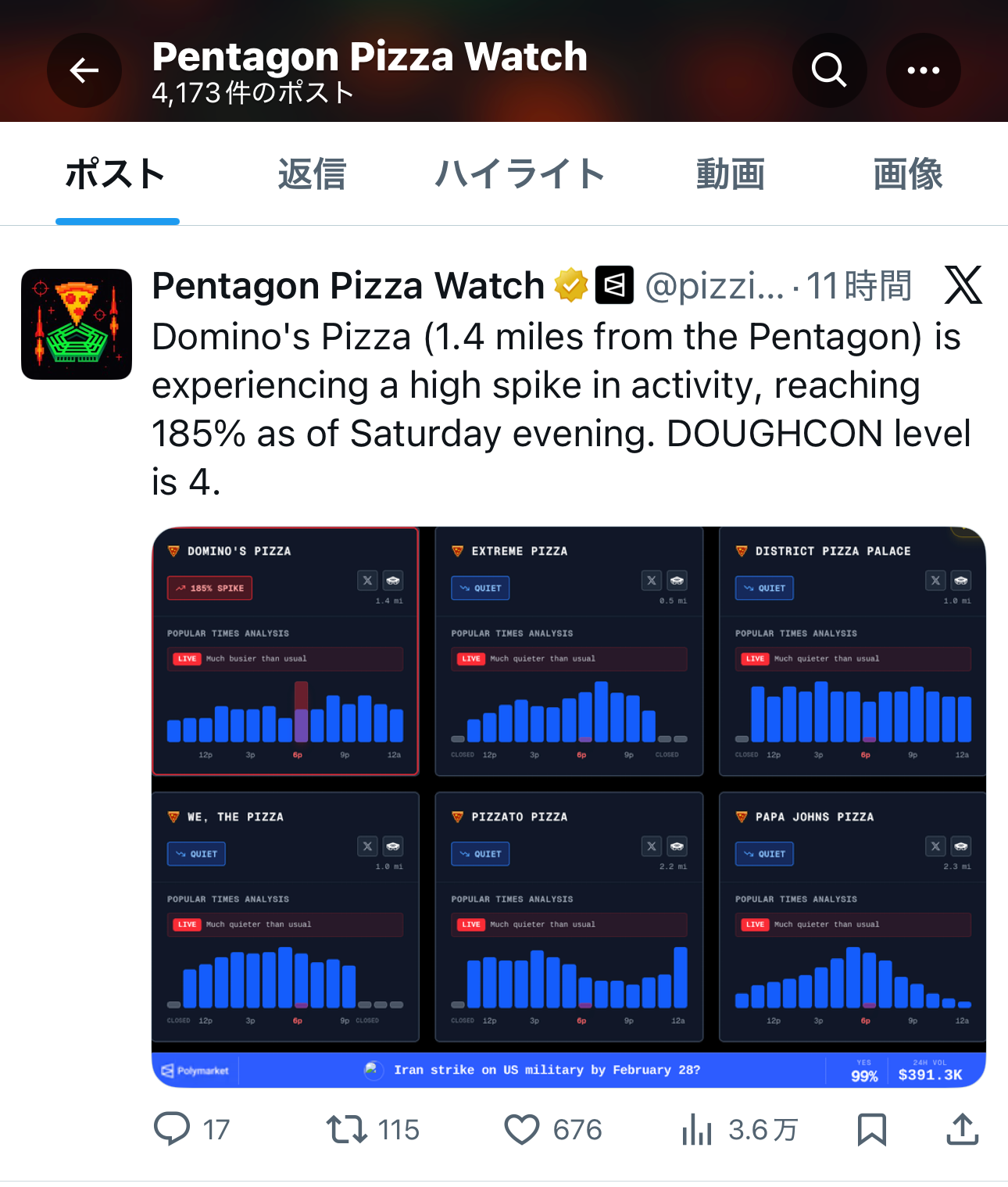 最近Xでちょっと不思議な指標が話題になっています。それが Pentagon Pizza Watch(ペンタゴン・ピザ指数)。アメリカ国防総省(ペンタゴン)周辺のピザ屋の注文量が急増すると、軍事的な動きが近い可能性があるというものです❗️